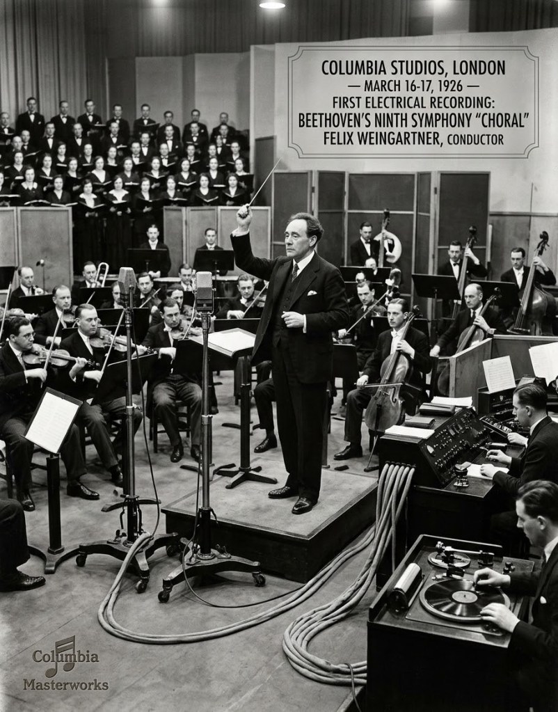 First Electrical Recording of Beethoven’s 9th: On March 16–17, 1926, conductor Felix Weingartner recorded Beethoven’s Symphony No. 9 “Choral” at Columbia Studios in London. This was a massive technical and historical milestone, functioning as the first complete electrical recording of the Ninth Symphony.